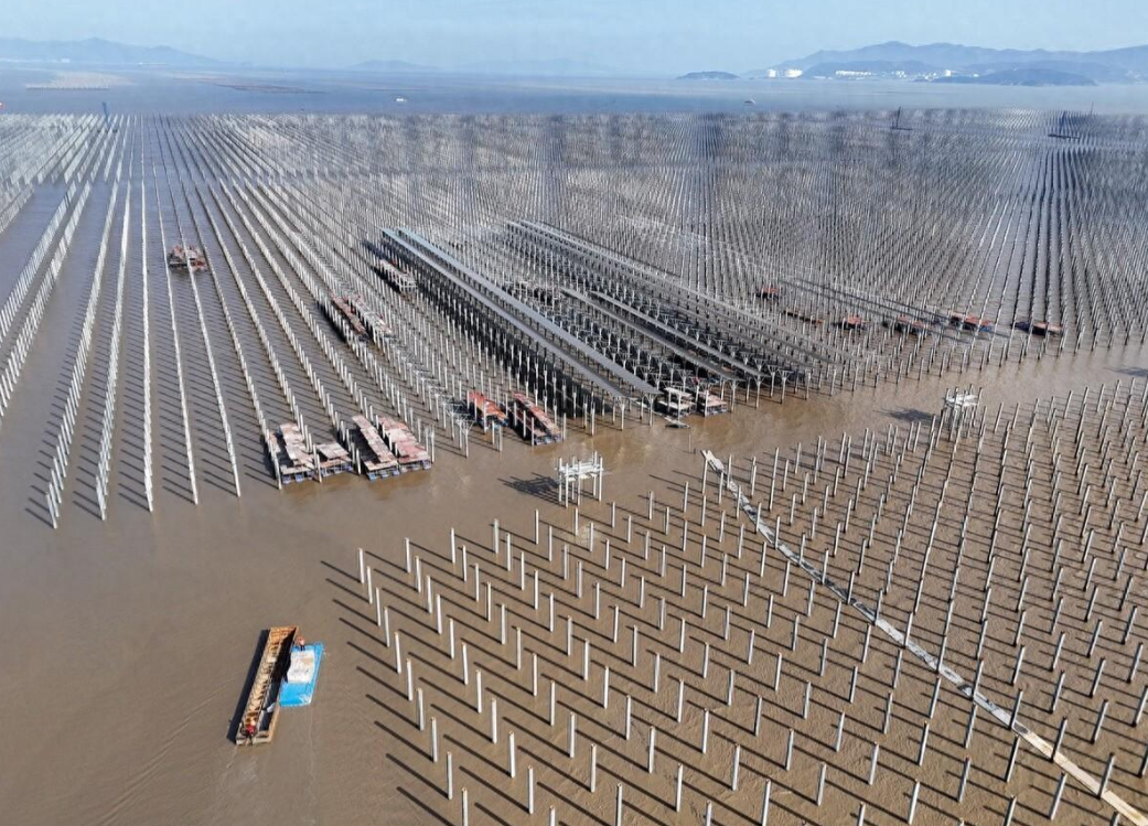 2024年3月3日,在浙江省温州市乐清湾的浅海滩涂上,工人们正在忙碌地安装光伏设备。这些设备被安装在整齐竖立的水泥桩上,犹如一支支巨大的银色笔杆,在阳光下熠熠生辉。这是一个名为“渔光互补”的光伏发电项目,它巧妙地结合了渔业养殖和光伏发电两种产业,实现了资源的最大化利用。